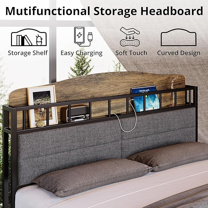 - Multifunctional Headboard: Sink into the plushness as you relax or read (upholstered foam headboard), and conveniently store your essentials on the built-in shelf. With a charging station included, you can keep your devices within reach, allowing you to unwind while staying connected.