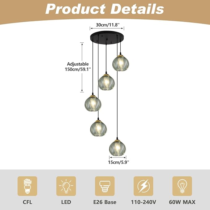 - Distinctive Green Globe Design: The 5-light green glass cluster pendant lighting is made of high-quality metal lamp body and glass shade, the glass shade have a unique green color with leaf vein textured, which would soften the lighting, emit a beautiful retro and warm glow when turn on. When the lighting passes through the glass shade, create a modern and romantic atmosphere and illuminate your home
