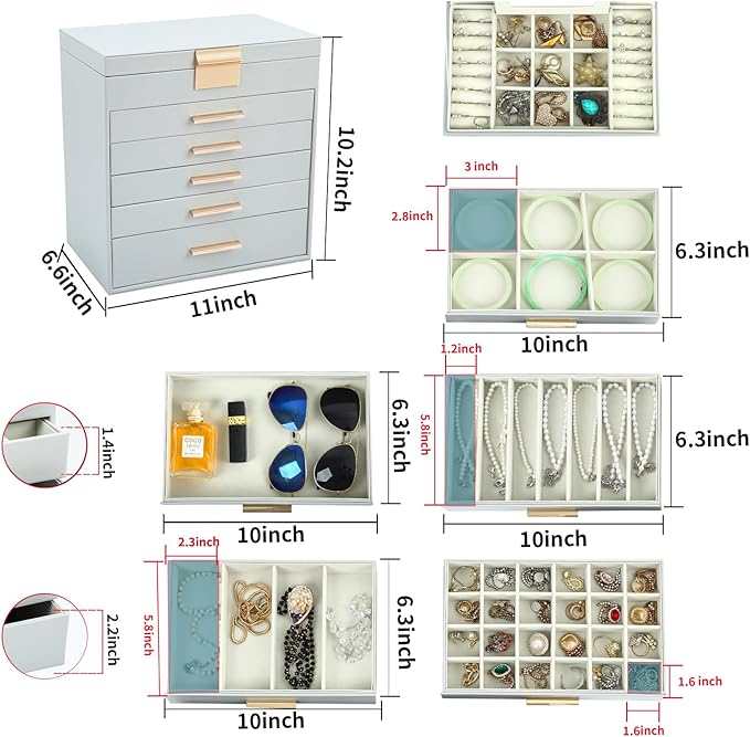 - Maximize Space and Time Saving for Makeup Table: With our 6 layer jewelry box, all your jewelry will be in good order and easy to reach. The deep bottom drawer stores bulky items like cosmetics or sunglasses, and the 4 long compartments in Layer 3 fit lipsticks, watches, or scarves. Jewelry organizers and storage made effortless!