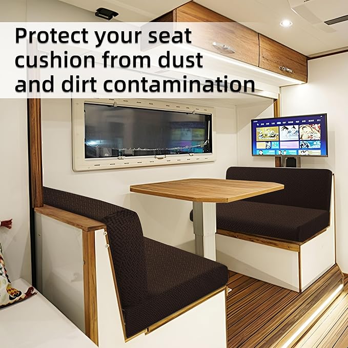 - [High Quality fabric] : This RV dining chair cushion cover is made of high quality soft and elastic microfiber fabric, gentle on the skin, bringing you unprecedented comfort. The 3D jacquard texture of the slipcover surface adds a touch of elegance to your motorhome. Our sofa cushion covers are fitted with 360 degree full coverage elastic non-slip bands for most sizes of motorhome cushions. Includes: 2 bench covers and 2 backrest covers.