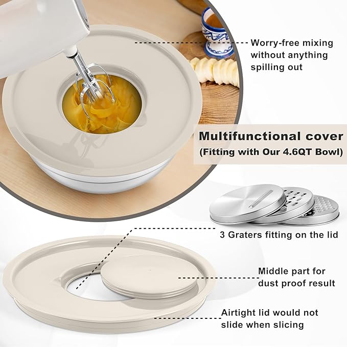 - 【Useful Largest Set with 3 Graters】Our largest lid have a 4.33-inch hole and a small fitting lid for dust-proof, Just mixing food easily with beater through the middle hole without splashing food everywhere, Also add ingredients quickly and help to save the hassle of opening cover repeatedly, 3 Different grater attachments are easy to cut food (slicing, grating and shredding) and then right into the bowl, Making your kitchen neat and be simple to prepare food before cooking