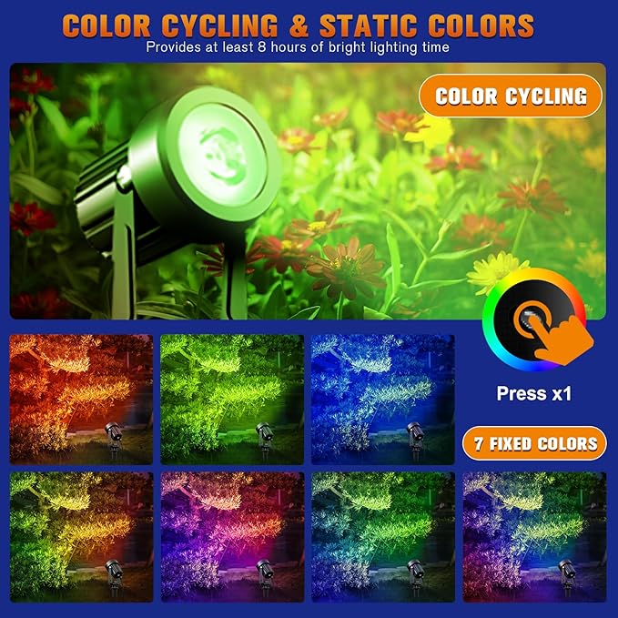 - 【RGB Solar Spotlights】Long press to turn on solar color changing lights outdoor with removable solar panel, switch between the two modes:colorful lights are great for Christmas and Halloween,but also for everyday decoration of your palm trees, gardens, walls and more