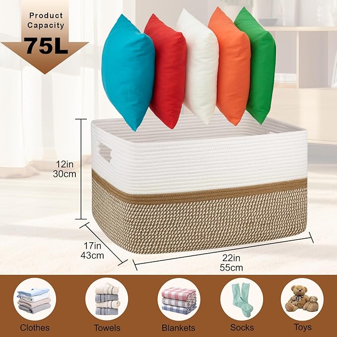 - Decorative Blanket Storage for Living Room:This rectangular blanket basket is more stable and easier to restore its sahpe after you receive the package. The 22’’ x 17’’ x 12’’ large storage basket can also used to store blankets, pillows, cushions, toys, clothes and towels