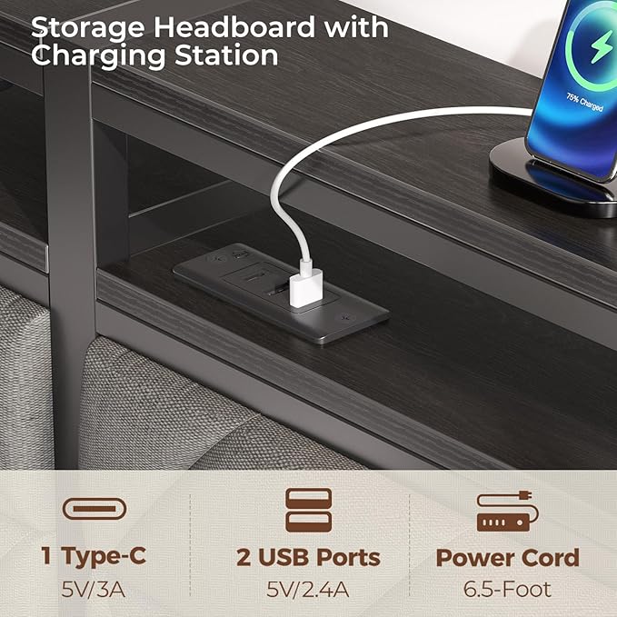 - Convenient Charging Station Bed: The headboard includes a built-in power panel with 2USB ports and 1 Type-C port, allowing you to conveniently charge your tablet, phone, or other mobile devices