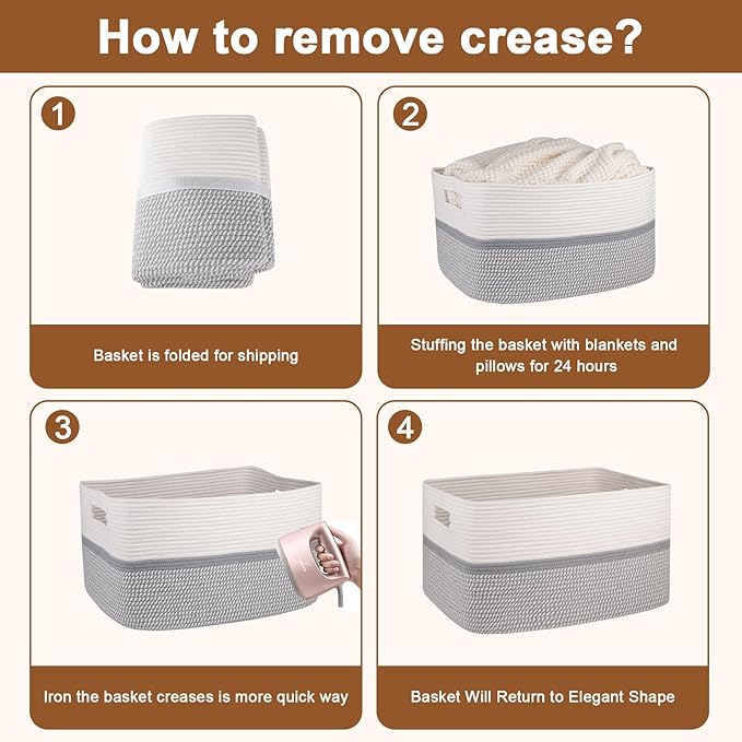 - NOTE: These cotton rope baskets are folded when shipping, but it will turn back to its elegant shape quickly if you fill it with some towels or clothing, and iron is great idea to remove the creases