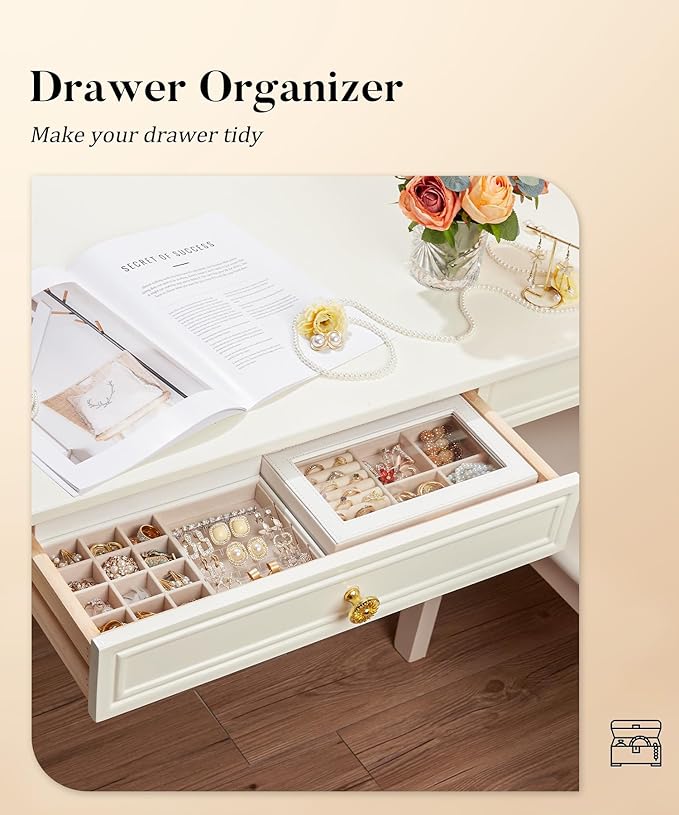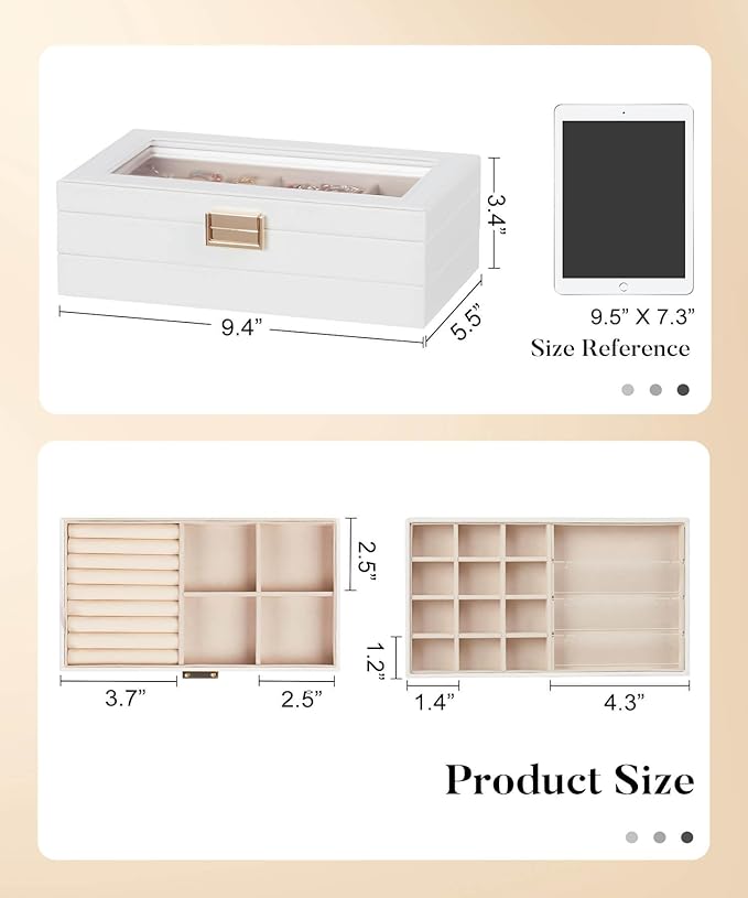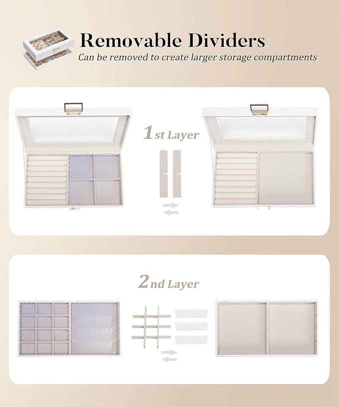 Homde Jewelry Tray Stackable Jewelry Box with Glass Lid, Removable Dividers for Vanity Table Gift Idea for Girls and Women (White)