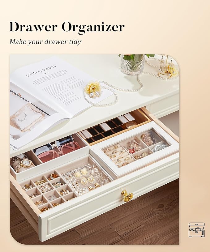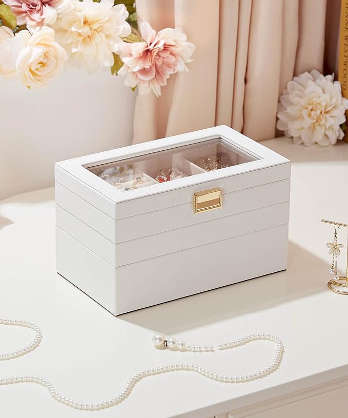 Homde Jewelry Tray Stackable Jewelry Box with Glass Lid, Removable Dividers for Vanity Table Gift Idea for Girls and Women (White)