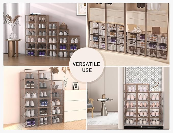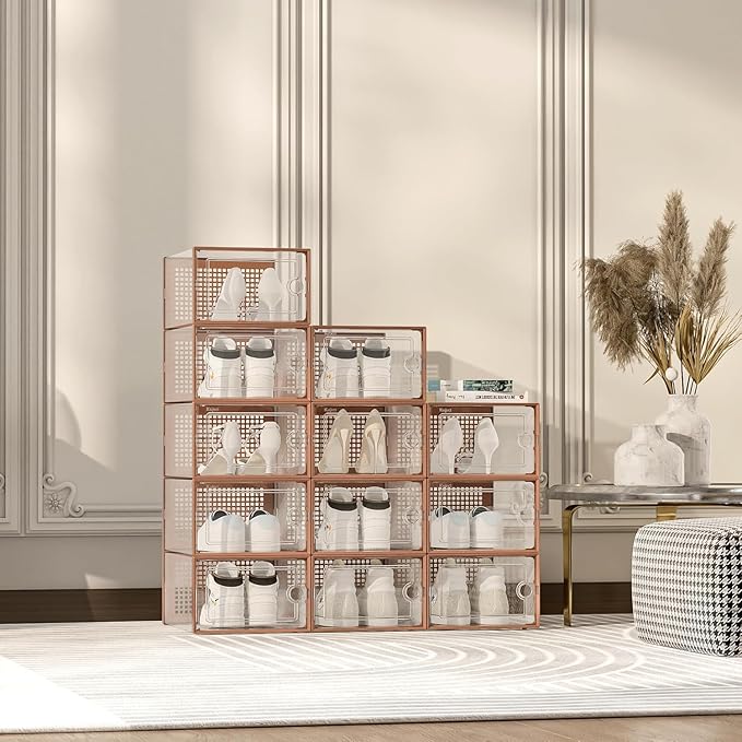 Kuject X-Large Shoe Storage Boxes Organizers for Closet 12 Pack, Fit Size 11,Clear Plastic Stackable Sneaker Containers for Entryway, Space Saving Shoe Rack,Substitute for Drawer Organize Unit, Brown