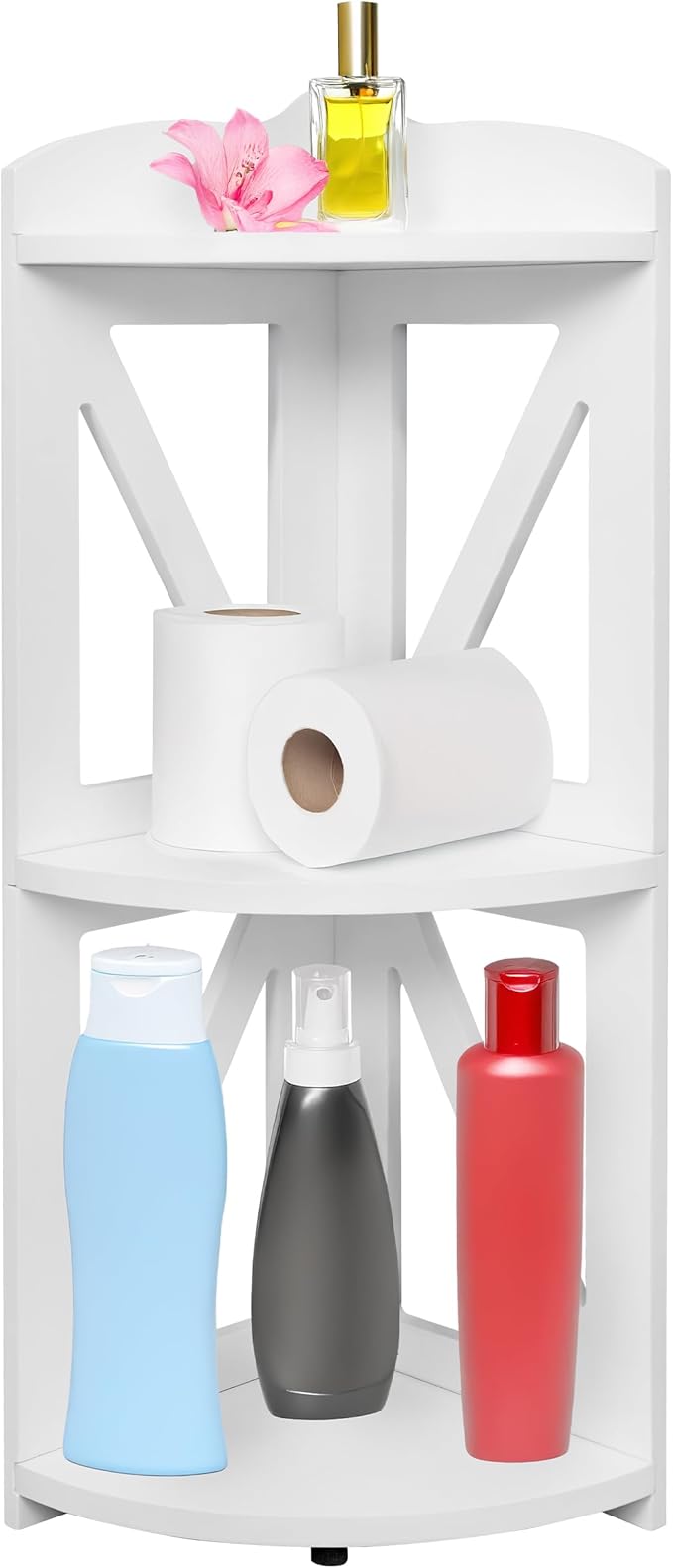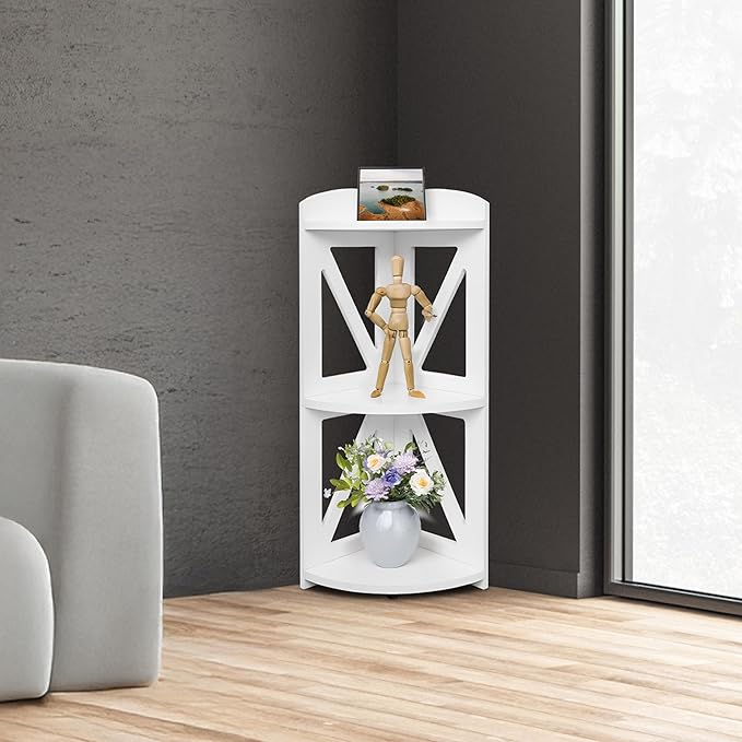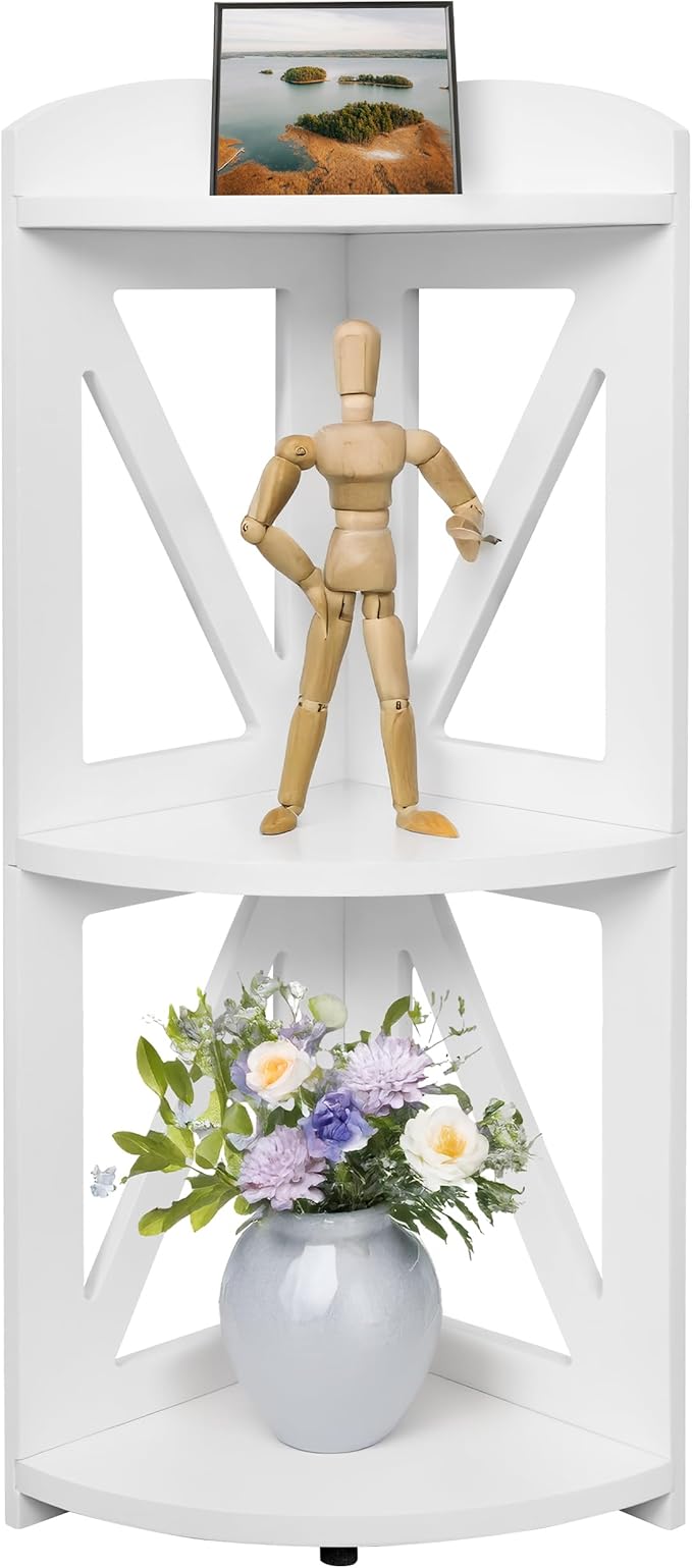 Corner Shelf Stand, Corner Bookshelf, Small Corner Shelves by Natural Wood, Plant Stand, Corner Bookcase for Living Room, Home Office, Bedroom, (White, 3 Tier)