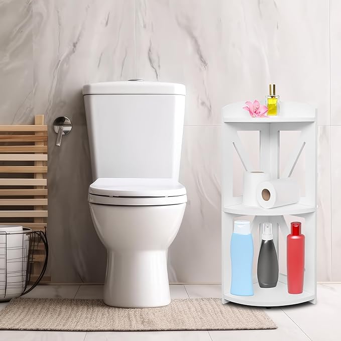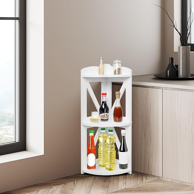 - [EASY TO INSTALL AND MOVE] The 3-tier corner shelf is designed for simple assembly, you only need 10 minutes to assemble it. The wooden plate at the foot has an anti-tip adjustment button to help it stand independently.