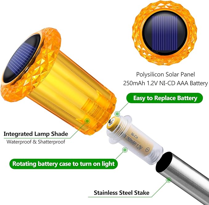 - OUTDOOR DURABILITY: The integrated acrylic lamp head is tightly connected to the battery base and equipped with stainless steel stakes, there are no external metal parts. It is waterproof, dustproof and rust proof. Therefore, solar lights for outside can be used in rain, snow or high temperatures.
