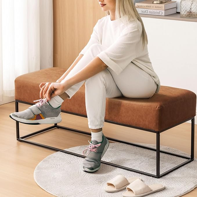 Entryway Bench for Bedroom End of Bed, Modern Ottoman with Faux Leather Upholstered Seating, Metal Frame Leather Bench for Bedroom Living Room Entryway [47'', Vintage Brown]