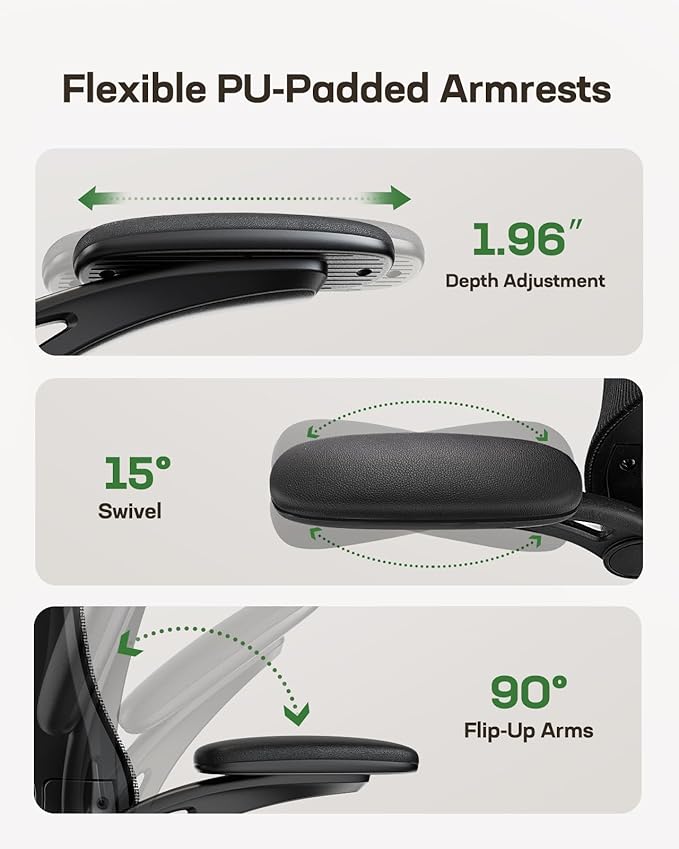 - Multi-Functional PU-Padded Armrests: Our office desk chair features flexible PU-padded armrests, customizing depth by 1.96", swivel up to 15° for optimal comfort, or flip them up 90° convenient space-saving.