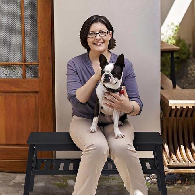 Nnewvante Bamboo Entryway Bench, 33.46" End of Bed Bench, 2 Tier Black Bench for Bedroom, Indoor Bench for Living Room, Dining Room, Hallway, Holds up to 300lbs