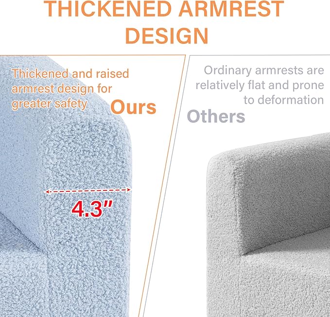 - 【Cloud-Like Back Support】This fluffy toddler chair is especially designed for little ones. Sitting in this fluffy toddler chair like snuggling a shining cloud. Toddler armchair cover is made of safe & skin-friendly durable cotton, we've utilized upgraded high-density sponge to enhance the durability and reliability of the kids chair, ensuring optimal protection for your child. So they will play games, eat snacks, watch TV, reading or just lie down and rest on the sofa.