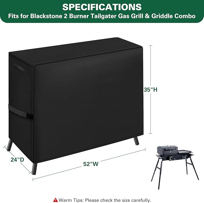 - 【Grill Cover Fit Model】Measures: 24"L x 52"W x 35"H. The grill cover fits for Blackstone 2 burner tailgater gas grill and griddle combo, model 1555/1550. (Please check the model of your grills carefully before ordering)