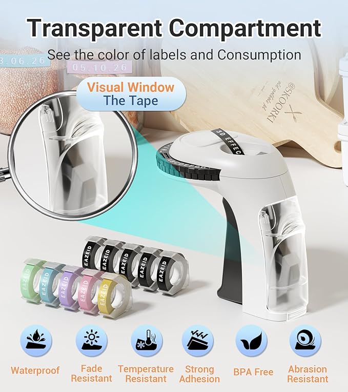 - Ergonomic Design 3D Embosser : The EazeID Omega S 3D personal embosser label maker, mini embossing label maker machine with tapes is thoughtfully designed with ergonomics in mind. It boasts a label-saving design, featuring a flat, wide handle that offers effortless gripping for users of all ages, including children and the elderly. The embossing label tapes are printed with clear letters, ensuring excellent readability