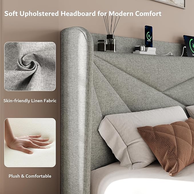 iPormis Queen Size Bed Frame with Charging Station, Linen Platform Bed Frame with Wingback Headboard Upholstered Bedframe, Solid Wood Slats Support, No Box Spring Needed, Easy Assembly, Light Grey
