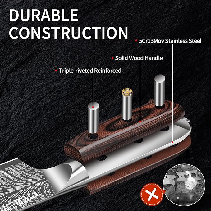 - Anti-stick Design - Enhance your prep efficiency with this premium chef knife. Its scalloped hollow edge creates a gap between the blade and the material being cut, effectively preventing sticking.