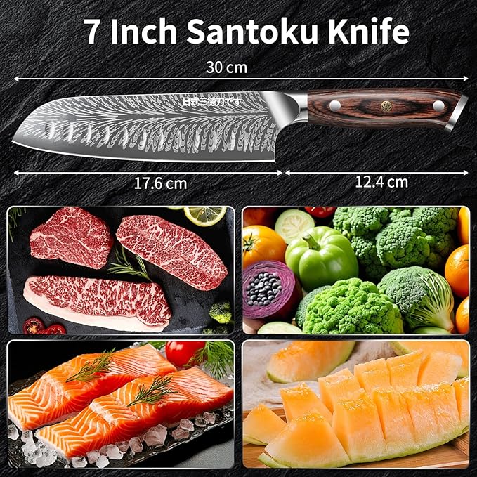 - Multi-functional Knife - This versatile Santoku knife is a kitchen essential. It excels at slicing, dicing, and chopping, making it ideal for handling vegetables, fruits, meats, and fish.