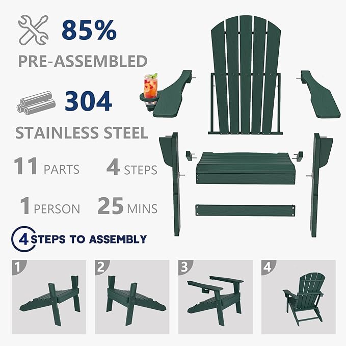 Plawdlik Folding Adirondack Chair, SGS Tested, Wooden Textured with Cup Holder, Heavy All-Weather HDPE Comfortable Set Poolside Backyard Lawn Green Set 4