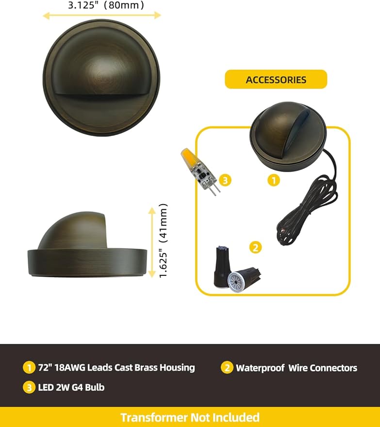 - Unique Design: The circular lamp holder's low height lets it hide in the grass or shrubs. The frosted lens eliminates glare letting you enjoy bright light. This brass deck light fixture with LED G4 bulb,only 2W deliver 180lm lighting effect to brighten your landscape.