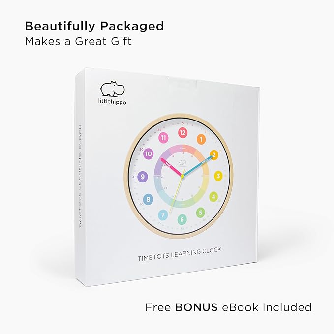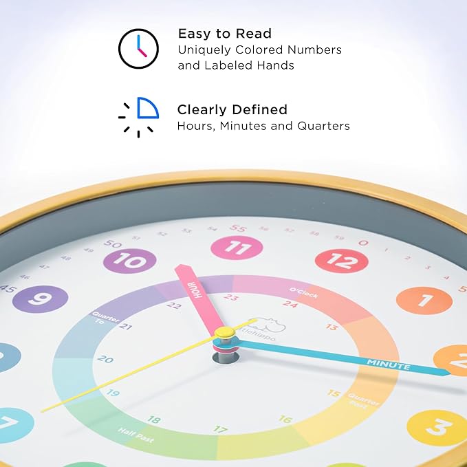 LittleHippo Learning Wall Clock for Kids for Classroom, Bedrooms, Nursery, Playroom - Kid's Analog, Silent, Non-Ticking Clock for Teaching to Tell Time, Study to Learn to Tell Time