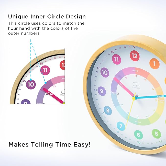 - INTUITIVE, EASY TO LEARN AND TEACH – The TimeTots wall clock makes teaching time easier than ever! Unlike other learning clocks, our clock uses ROYGBIV (chronological rainbow colors) to illustrate the passage of time, and the inner circle’s colors correspond to the hour numbers so children can easily grasp the current hour.