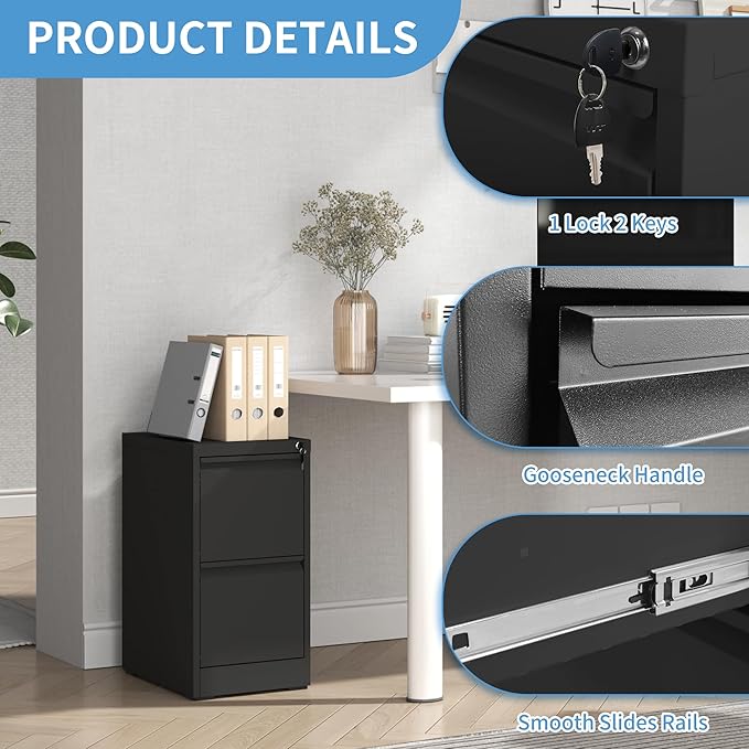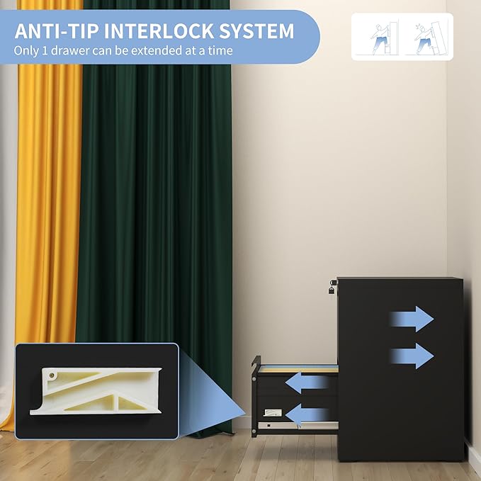 - ◉【Lockable & Secure】All the drawers of file cabinet can be locked by one lock, when one drawer of the metal file cabinet is opened, the anti-tilt and interlocking system prevents the other drawer from opening, ensuring your safety.