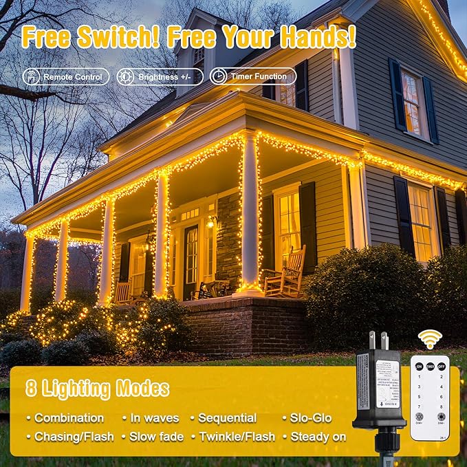 - 【String lights for Outdoor Indoor】This 132ft LED string lights set with 400 warm white bulbs can enhance various spaces beyond holidays. Suitable for decorating patios, garden, fences, or balcony railings in spring and summer