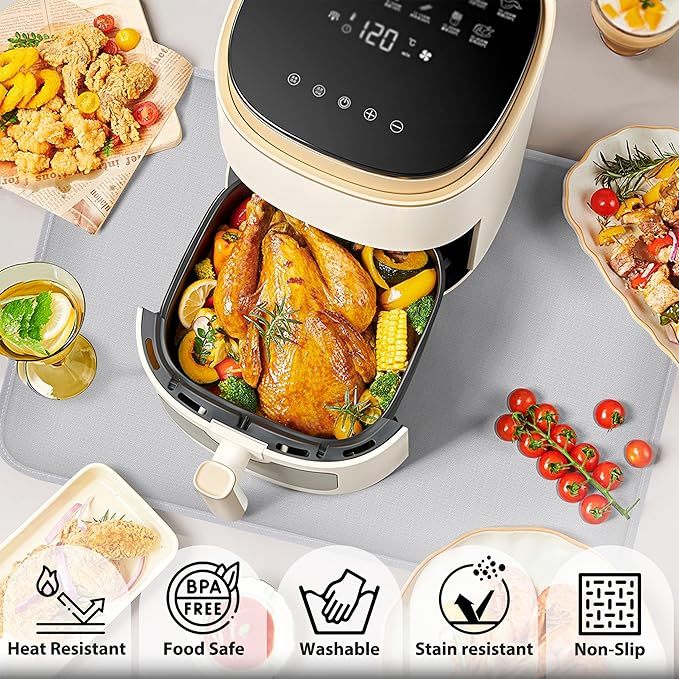 Heat Resistant Mat for Air Fryer Site - 23.6 x 15.7in, Fireproof Silicone Mats for Kitchen Counter, Heat Proof Mat, Non-slip & Waterproof for Deep Fryer, Oven, Coffee machine (Silver)