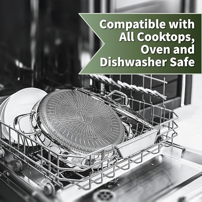 - Compatible with All Cooktops-This stainless steel pan is friendly with induction cooktop, gas stovetop and electric stove, tri-ply stainless steel structure brings better heat distribution and longer heat preservation than usual pan. Metal utensils, stainless steel and wooden utensils are all acceptable. Cleanup is a breeze. It is safe to use in the oven and dishwasher.(Oven safe up to 500℉, 400°F with Glass Lid)