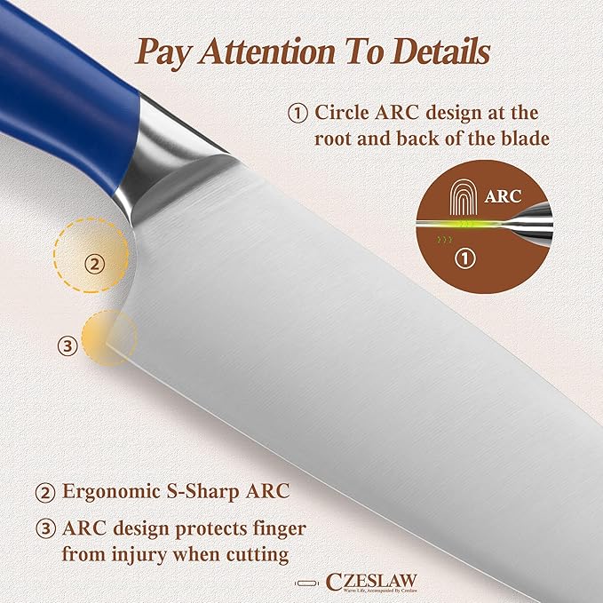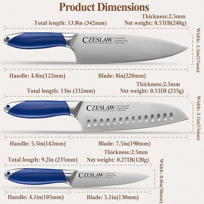 - 【Chef Knife set Includes】: This three-piece knife set comprises an 8" chef's knife, a 7" santoku knife, and a 5" kitchen utility knife. All knives are razor-sharp upon purchase, ensuring they are ready to tackle any cooking task. The Czeslaw chef knife set is an excellent addition to your kitchen arsenal, making it your best cooking companion.