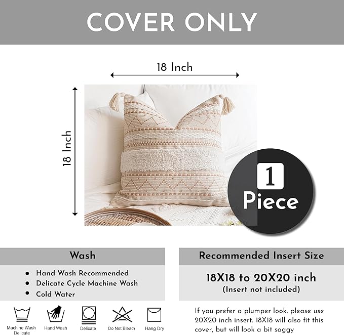 Decorative Throw Pillow Cover 18x18 Square Cream Neutral White Boho Accent Pillowcase Tassels Farmhouse Cushion for Couch Sofa Bedroom Living Room Home Décor (Cover ONLY, Pack of 1)
