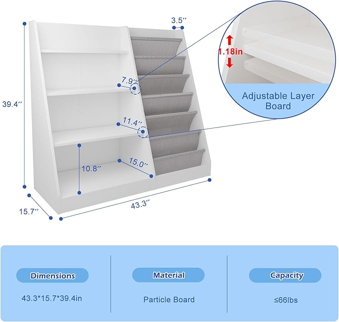 - Nursery Bookcase with Toy Organizer: Dimension: 43.3inch*15.7inch*39.4inch. This kid book rack comes with all hardware necessary for assembly. With easy-to-follow and step-by-step manual instruction, you will have your children’s bookshelf ready in no time. If you have any question about this item, you can contact us at any time and we will reply you in 7*24.