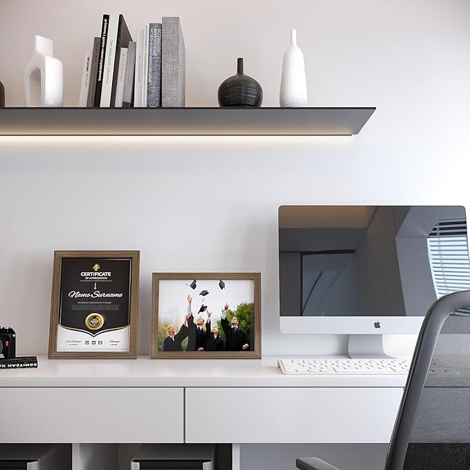 - ATTRATIVE DESIGN: These 8.5x11 document frames exhibit Brown Wood color and curved Bevel. Their smooth wood grain lines can almost complement any decorative styles. These 8.5x11 Brown wood picture frames perfectly matched with certificate, pictures, photos, prints which is suitable for highlighting memorable times.