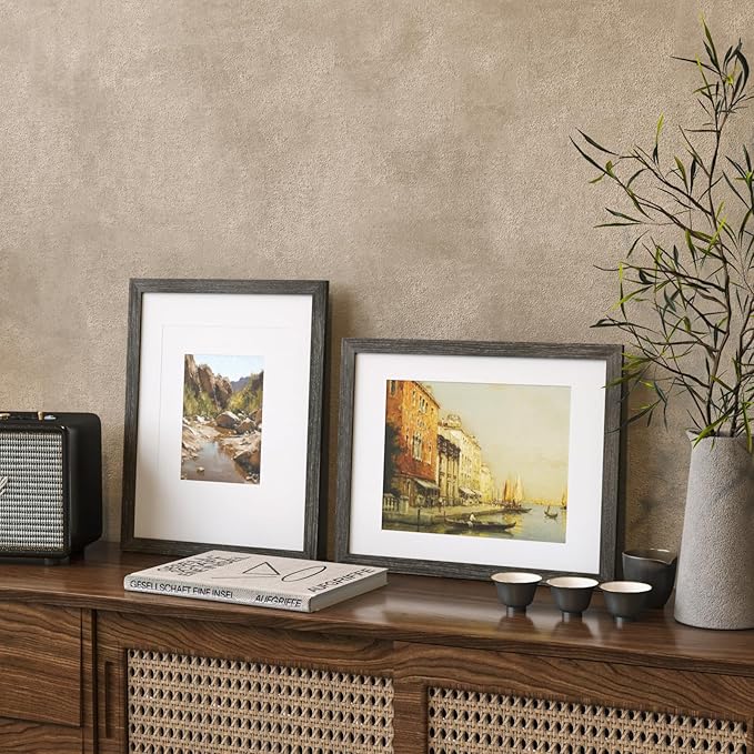 - ATTRATIVE DESIGN: The ash black 11x14 picture frame with mat smooth wood grain lines can almost complement any decorative styles. The simple outlook combined with exquisite details, which is suitable for highlighting your valuable memorable times.