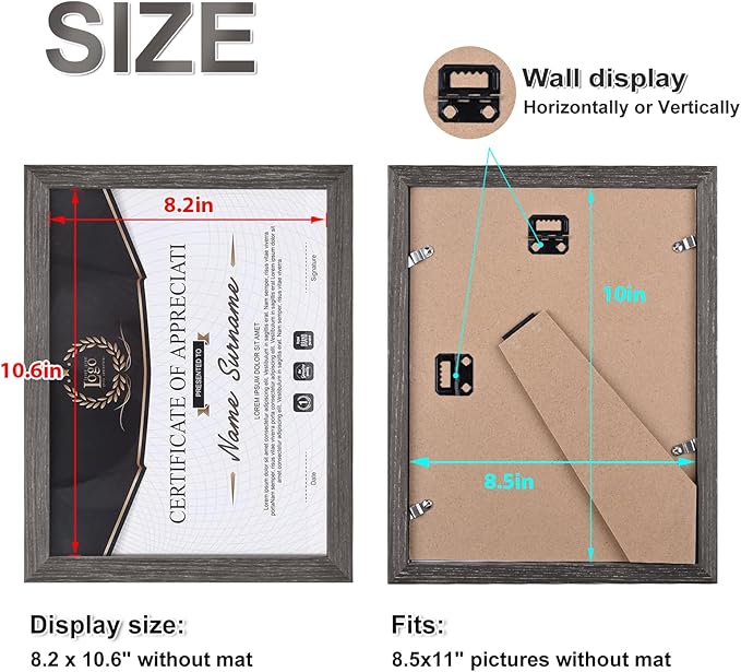 - VERSATILE DISPLAY: You can display these wood wall frame 8.5x11 in various ways like hanging it on the wall or place it on the table either vertically or horizontally. It is awesome to create a personalized gallery wall. Hanging hardware is include in the package.