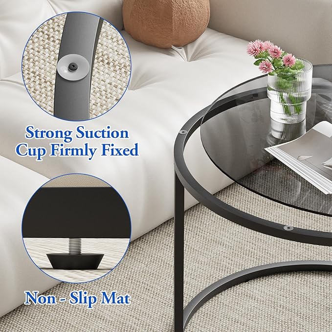 aboxoo Nesting Coffee Table Grey Glass Table Set of 2, Small Round Glass Nesting Tables for Living Room Bedroom, Accent Tea Table with Metal Frame Modern Industrial Simple