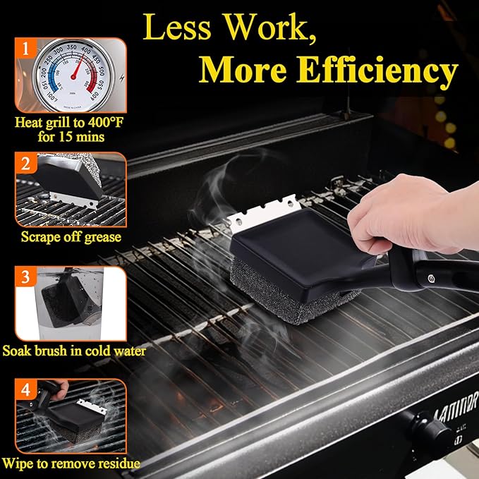 - [Safe & High-quality BBQ Accessories] With a non-slip and heat-resistant design,the 18.8-inch extra long ergonomic grill brush handle making it easy to scrub those hard-to-reach areas that allows you to easily transfer power to the brush head and protects your hands from heat.This essential grill cleaner makes it easy to enjoy healthy and delicious food!