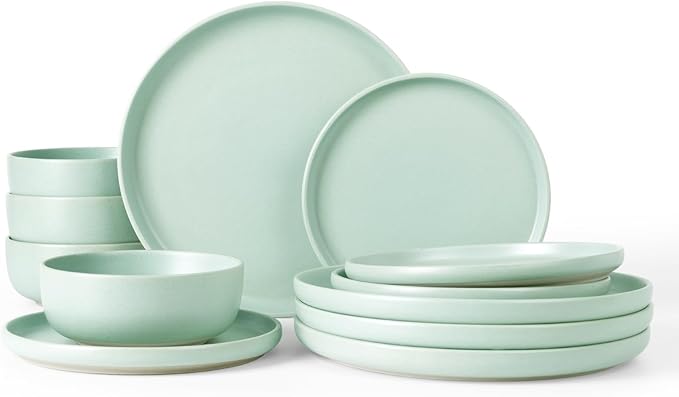 Famiware Milkyway Plates and Bowls Sets, 12 Pieces Dinnerware Sets, Reactive Glaze Dish Set, Stoneware Dishes Set for 4, Light Green