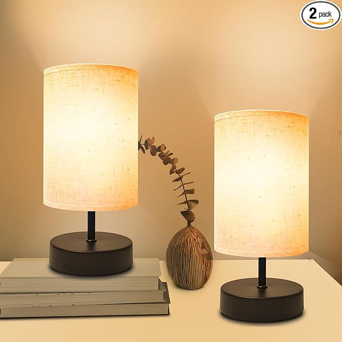 Small Table Lamp, Minimalist with Flaxen Shade, 9 Inch Design for Bedroom & Dorm Room, 2 Pack
