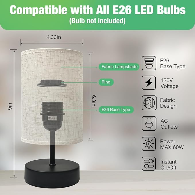 - 【Minimalist Design】This 9 Inch bedside lamps elegant and stylish appearance, Round flaxen open fabric design lampshade matching small black base. Exquisite size and unique design make this small table lamp an Ideal choice for living room, bedroom, study, student's room, etc., adding a cozy and warm atmosphere to your bedroom or living room home decoration.