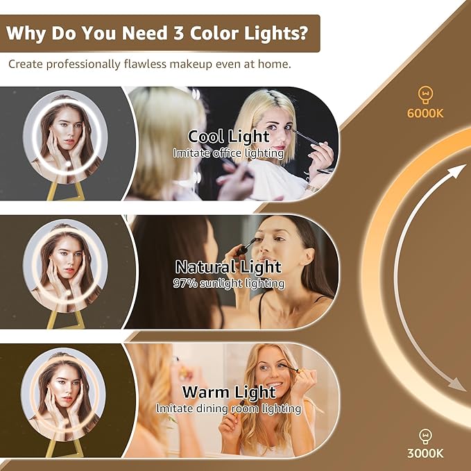 - Vanity Mirror with Lights: Our round mirror with built-in LED lights offers soft, balanced illumination, making it easy to achieve flawless results. Enjoy 3-mode lighting that mimics natural daylight, office and dinning room lighting, helping you feel confident and look your best