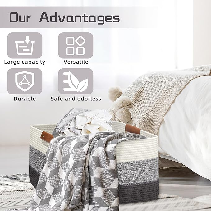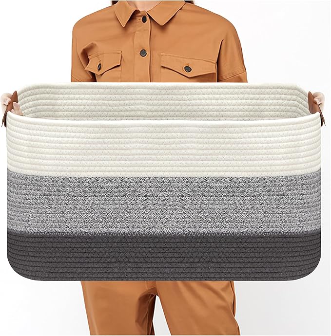 - Decorative & Versatile: Pure Natural Material Elevates Any Space - Laundry, Toys, or Blanket Storage Solution.The elegant leather handles not only take care of your hands but also add a distinctive highlight to our large baskets.