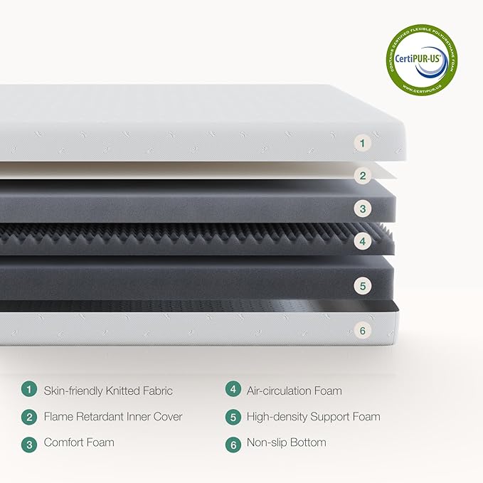 - PRESSURE RELIEF & STABLE SUPPORT - The queen mattress layers consist of 5" comfort foam, 3" egg crate foam and 2" High-Density Base Foam. Our queen mattress conforms closely to the body's shape and relieves pain at pressure points. The supportive base generates enough pushback to provide excellent support to the body. The edge support on both sides of the mattress is reinforced to prevent slipping when sitting on the mattress edge.
