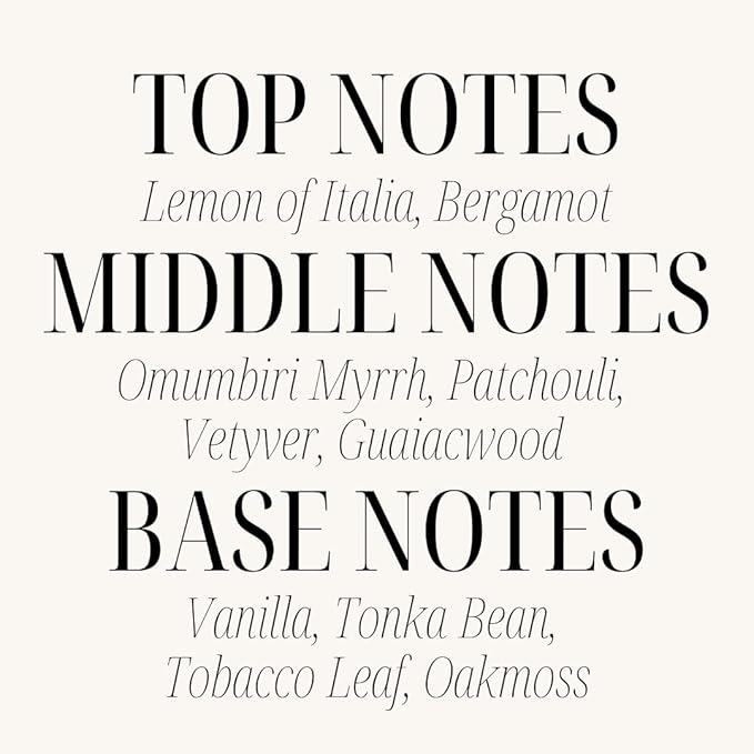 - Top notes: Lemon of Italia & Bergamot, Middle notes: Omumbiri Myrrh, Patchouli, Vetyver, Gaiac Wood, Base notes: Vanilla, Tonka Bean, Tobacco Leaf, Oakmoss