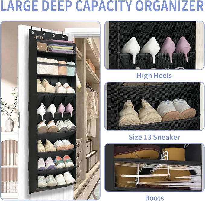 - 8 Shelves Large Capacity: Over the door shoe rack measures 68"H*16.5"L*6"W. Please measure the height of the door is greater than 71 inches before buying. Hanging shoe storage with 13 pockets in different sizes can hold more than 22 pairs of shoes.Shoe closet organizer is large and deep enough to store high heels and boots.And back of door shoe organizer is a great home storage organizer and helps to increase more space for over door, closet, wall, dorm, and RV, making your room more tidy and clean.