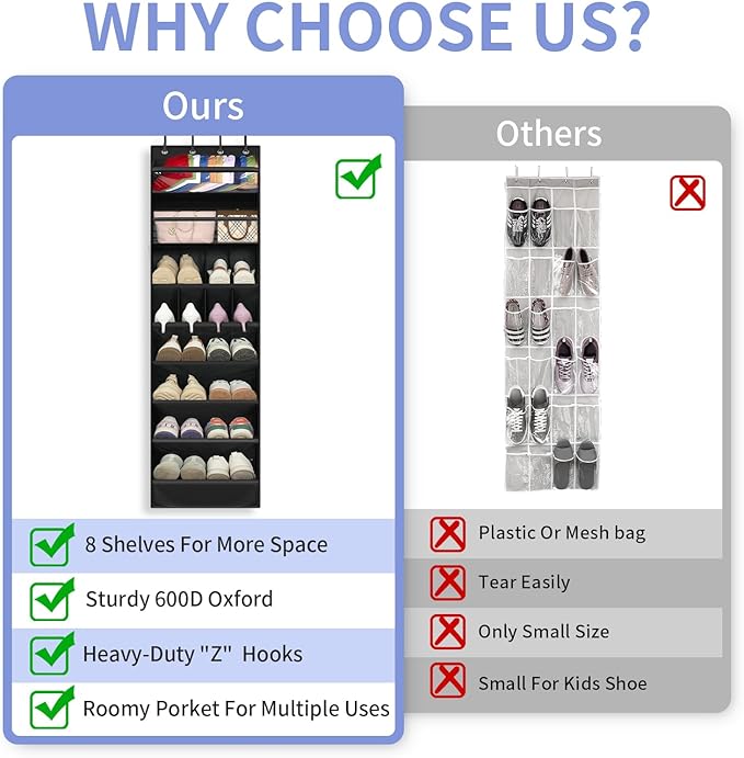 - Special Feature : 8 Shelves large capacity door shoe rack, Collapsible over the door shoe organizer, Please measure the height of the door is greater than 71 inches before buying., Space saving shoe organizer for closet, Sturdy 600d Oxford Material 8 Shelves large capacity door shoe rack, Collapsible over the door shoe organizer, Please measure the height of the door is greater than 71 inches before buying., Space saving shoe organizer for cl… See more