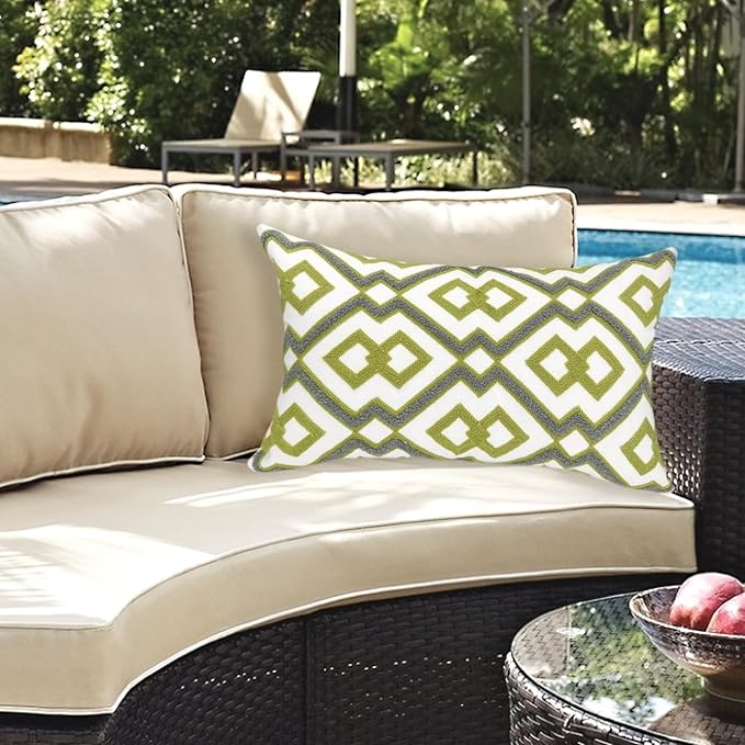 Alysheer Embroidered Lumbar Decorative Throw Pillow Cover 12"x 20", Classic Boho Geometric Embroidery Pattern Cotton Rectangular Cushion Case for Sofa Couch Living Room Bedroom(Green Grey)